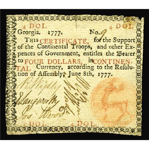 Georgia June 8, 1777 $4 Very Fine. Georgia June 8, 1777 $4 Very Fine.