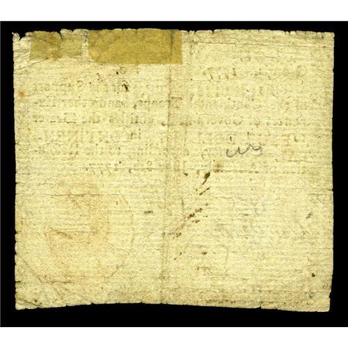<B>Georgia June 8, 1777 $4 Very Fine.</B></I> This seldom seen Georgia note comes in two varieties, with this the scarcer version where the word "In" is in black letters. A tape repair on back is noted, in order to strengthen the upper border.