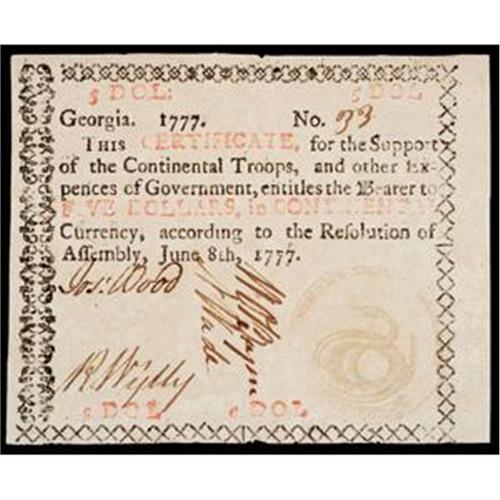 Georgia, June 8, 1777, $5, "Rattlesnake" vignette, with red "in," Choice Crisp About Uncirculated.