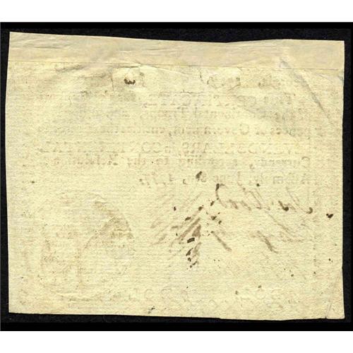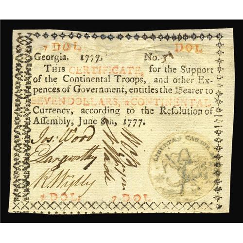 <B>Georgia June 8, 1777 $7 Extremely Fine Restored.</B></I> Interestingly, this note has the red "in" in the fourth line and is Serial Number 5. In general, the much scarcer black "in" is found on the low serial numbered notes since they were printed first. Alignment problems that arose caused the change over to the red "in." This is the lowest number of this issue that we can recall having seen with the red "in." The top edge has been rebuilt on this barely-circulated, boldly-signed Georgia note. Save for the restoration, this would be a $2,000 piece with its outstanding appearance. As it lays, we would expect a realization of approximately...