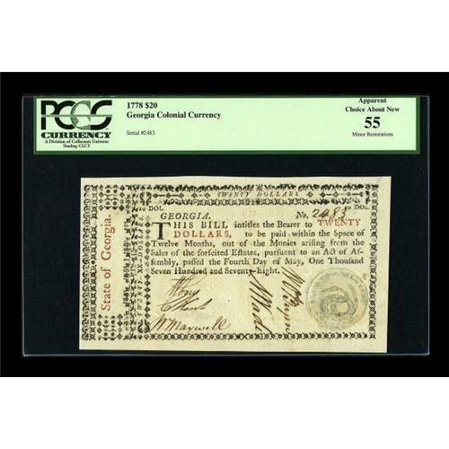 <B>Georgia May 4,1778 $20 PCGS Apparent Choice About New 55.</B></I> We have handled only a few higher graded notes of this number over the years. Embossing is seen through the PMG holder while the signatures and printing are dark. The label reads "minor restorations" and there is a small repaired internal tear. <BR><BR><b>Shipping:</b> Coins & Currency (<a target="_blank" href="http://www.heritageauctions.com/common/shipping.php">view shipping information</a>)