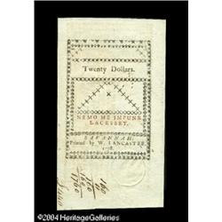 Georgia May 4, 1778 $20 Superb Gem New. Cut from th <B>Georgia May 4, 1778 $20 Superb Gem New.</B></I> Cut from the same sheet as the two notes in the following lots, but this one does not have a sheet fold and has the broadest margins of the three. It's a simply superb piece with its only flaw being some pen notations in the blank area of the back. All five signatures, including that of William Few, are as bold as the day they were applied. <BR><BR><B>Important notice:</B> Heritage usually auctions material at the rate of 200-250 lots per hour. On some occasions eBay Live bid software or the Internet may not be able to keep up with the pace of the auction. We recommend placing a realistic absentee bid now as insurance to avoid disappointment. Occasionally the auctioneer may eliminate or reject an eBay Live bid, and the auctioneer may also reopen a lot after the close of the eBay live bidding (usually because we missed an audience bid), and may reject your bid even if it shows you as the winning bidder. By bidding via eBay Live, you agree that Heritage may award the lot to another bidder at its sole discretion under the circumstances described above or any other reasonable circumstances. Since eBay bids are not shown to us until we open the lot on the floor, we treat those bids just like floor bids. In most cases the floor responds before the eBay bid is presented to us, due to Internet lag time, so for consistency we have made it a policy that floor bids are always considered first over tie eBay live bids. Also please note that all Heritage lots purchased through eBay Live carry a 20% Buyer's Premium. Please make sure you read the Terms and Conditions before you bid. This lot is being auctioned in conjunction with a live floor auction by Heritage Galleries & Auctioneers. All final auction and invoice information will be supplied by Heritage Galleries & Auctioneers, and all other information should be considered preliminary. Lot:15123