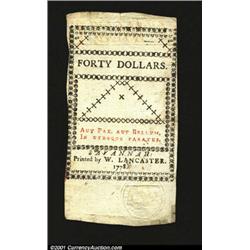 Georgia May 4, 1778 $40 Extremely Fine-About New.<p>The margins are very tight and touch the edge design in most places, but this Georgia note shows very little in the way of actual circulation. A few short edge splits have been tape-repaired on the back, but the note has no other faults. The blue vignette is dark and razor-sharp. Important notice: We expect to be auctioning lots at the rate of 200-250 per hour. Sometimes eBay Premier live bid software cannot keep up with that pace, so we strongly recommend that you place a realistic proxy bid now as insurance to avoid disappointment. Also please note that all Heritage/CAA lots purchased through eBay Premier carry a 20% Buyer's Premium.