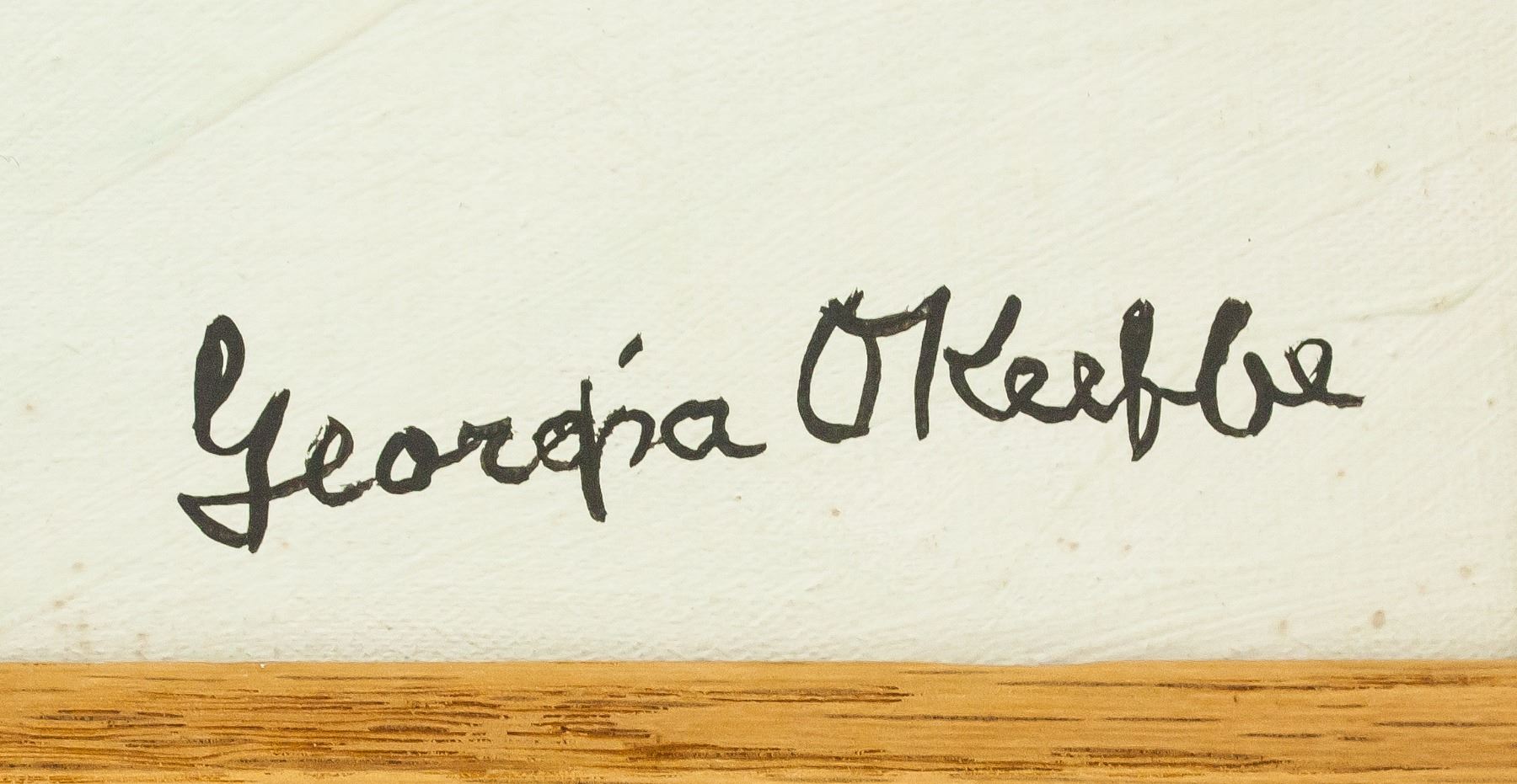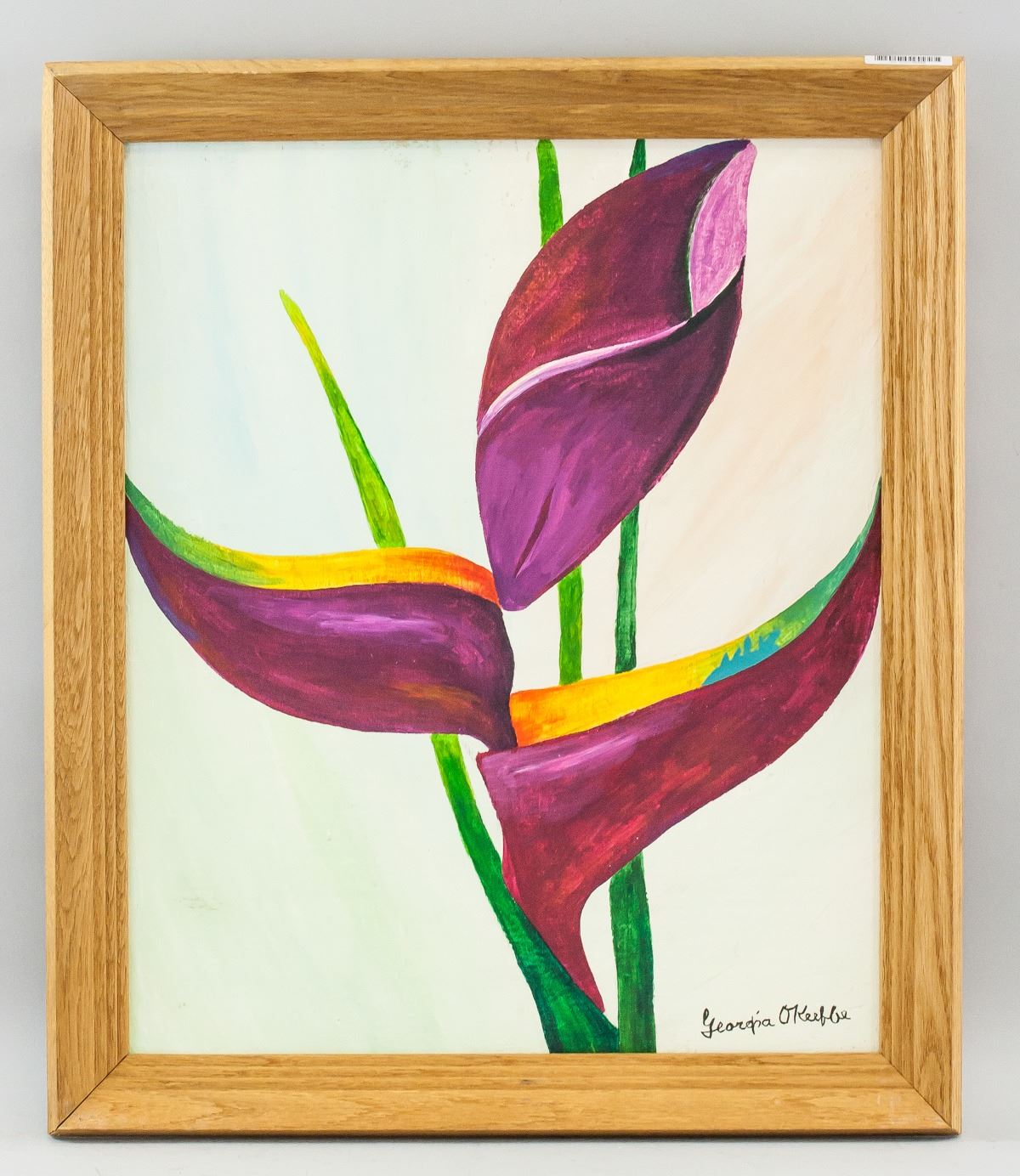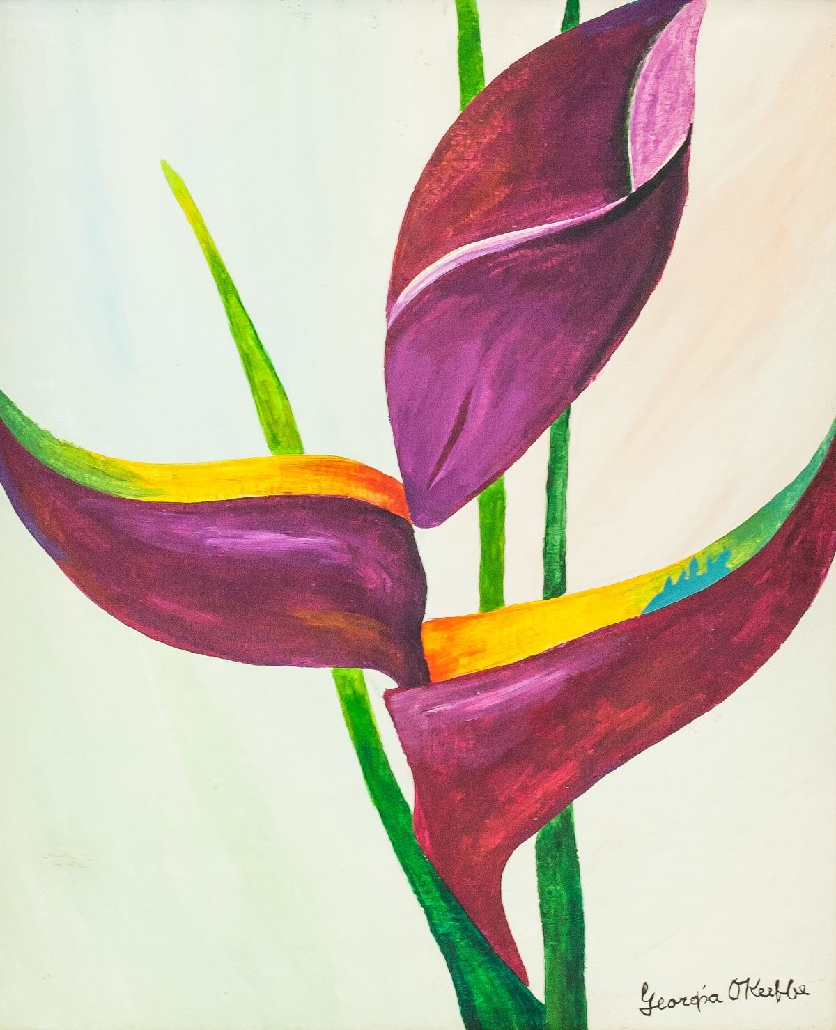 Oil on canvas, framed. Featuring bird of paradise flower. Signed "Georgia O'Keeffe" in the bottom right corner. Attributed to Geogia O'Keeffe (1887-1986, American). 49 x 41 cm (19 x 16 inches). Framed size: 56 x 47 cm (22 x 18.5 inches). PROVENANCE: This lot carries limited provenance from a Southern Ontario estate