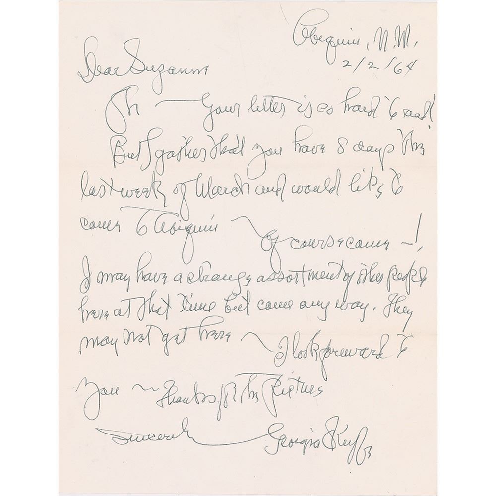ALS, one page, 8.5 x 11, February 2, 1964. Letter to "Suzanne," in part: "Your letter is so hard to read! But I gather that you…would like to come to Abiquiu. Of course come! I may have a strange assortment of other people here at that time but come any way. They may not get here." In fine condition. O'Keeffe spent much of her time in Abiquiu, New Mexico, where she found inspiration in the diverse desert landscapes.