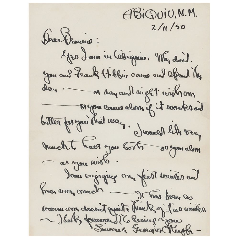 ALS, one page, 8.5 x 11, February 11, 1950. Handwritten letter to "Brownie," in full: "Yes I am in Abiquiu. Why don't you and Frank Hibbin come and spend the day—or day and night with me—or come alone if it works out better for you that way. I would like very much to have you both—or you alone—as you wish. I am enjoying my first winter out here very much—It has been so warm one doesn't quite think of it as winter. I look forward to receiving you." In fine condition.