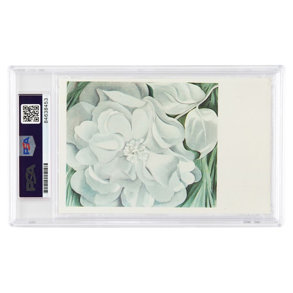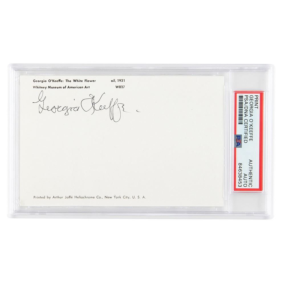 Attractive color 3.5 x 5.5 postcard of O'Keeffe's 1931 oil painting 'The White Flower,' signed on the reverse in black ballpoint, "Georgia O'Keeffe." In very fine condition. Encapsulated in a PSA/DNA authentication holder.
