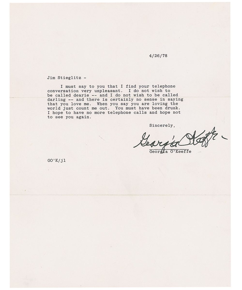 TLS, one page, 8.5 x 11, April 26, 1978. Letter to Jim Stieglitz. In full: “I must say to you that I find your telephone conversation very unpleasant. I do not wish to be called dearie—and I do not wish to be called darling—and there is certainly no sense in saying that you love me. When you say you are loving the world just count me out. You must have been drunk. I hope to have no more telephone calls and hope not to see you again.” In fine condition. In 1981, Stieglitz, the grandson of a brother of O’Keeffe’s late husband, would be charged by the FBI for illegally copying and printing O’Keeffe’s works as lithographs, selling them for $1000 a piece.