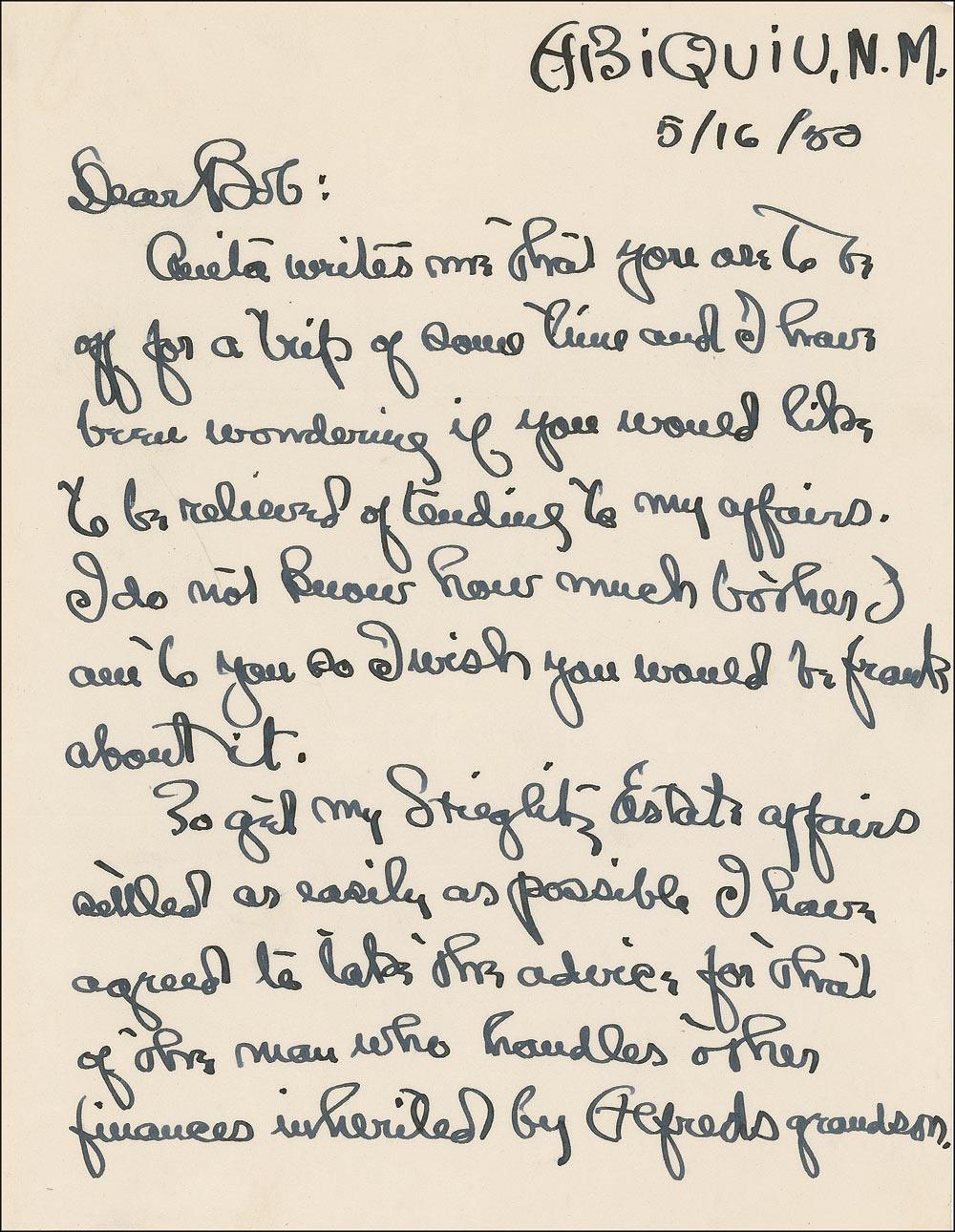 Beautifully-penned ALS signed “Georgia,” four pages, 8.5 x 11, May 16, 1960. O’Keefe writes from Abiquiu to her sister’s husband, Robert Young. In part: “Anita writes me that you are to be off for a trip of some time and I have been wondering if you would like to be relieved of tending to my affairs. I do not know how much bother I am to you so I wish you would be frank about it.