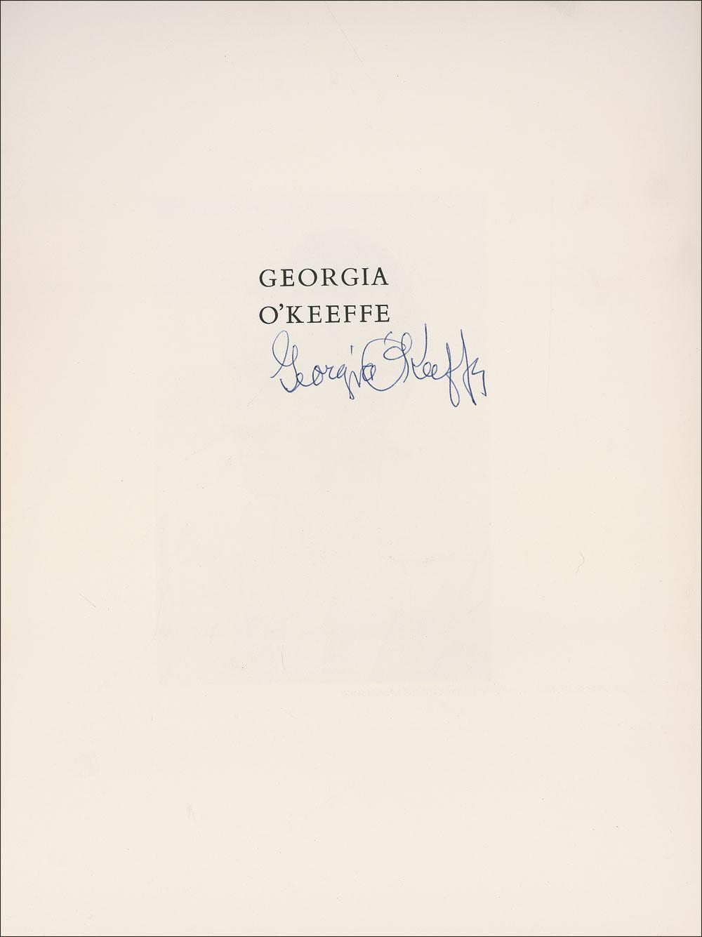 Signed book: O’Keeffe. NY: 1970. Softcover, 8.75 x 11, 196 pages. Published on the occasion of an O’Keeffe retrospective exhibition organized by the Whitney Museum of American Art, signed on the half-title page in blue ballpoint by O’Keeffe. In fine condition, with some mild toning and soiling to covers and a hint of light sunning to the spine. A handsomely illustrated study. Pre-certified PSA/DNA and RRAuction COA.