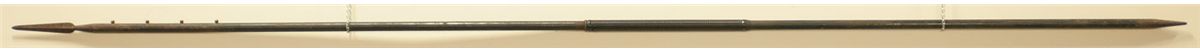 10' 6" long, sharp edge at the base for setting in the ground and a diamond shaped blade on the top, 17" section in the center of the pole has a grooved black rubber handle for grip.