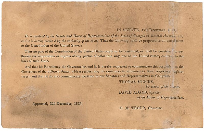 Rare printed document signed in type,“Thomas Stocks” as President of the Senate, “David Adams” as Speaker of the House, and “G.M. Troup” as Governor of Georgia, one page, 8 x 5, dated December 17, 1823. Resolution reads, in part: “Be it resolved by the Senate and House of Representatives of the State of Georgia…That the following shall be proposed as an amendment to the Constitution of the United States: that no part of the Constitution of the United States ought to be construed, or shall be construed, to authorized the importation or ingress of any person of color into any one of the United States, contrary to the laws of such State.” Reverse is addressed in an unknown hand to “His Excellency The Governor of Mississippi Rocky Springs.” Professional repairs to complete vertical separations and scattered toning, otherwise very good condition. In 1822, South Carolina passed ‘An Act for the Better Regulation of Free Negroes and Persons of Color’ which required any free black sailors entering the state be ‘seized and confined’ in jail until the vessel that brought them ‘shall clear out and depart from this state.’ That act was ruled to be unconstitutional as it violated the power of Congress to regulate interstate commerce, which included navigable waters, and violated a treaty with Great Britain ensuring its right to engage in free trade with the United States.