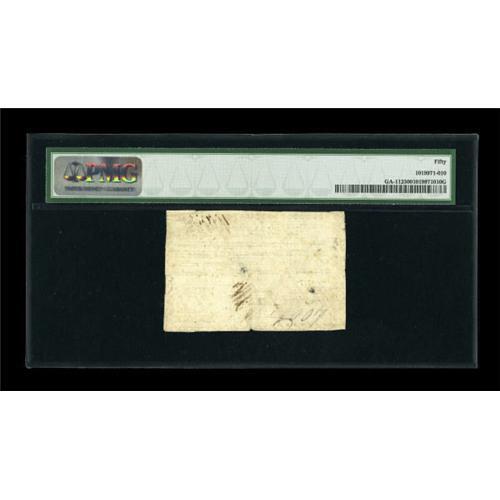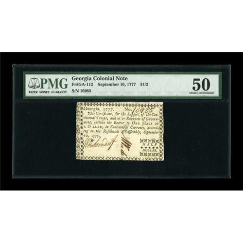 <B>Georgia September 10, 1777 $1/2 PMG About Uncirculated 50.</B></I> This is a wonderful example of a very scarce issue and the half dollar denomination is listed in Friedberg as being the scarcest and one of the most valuable. The paper is unusually bright for a Georgia note and there are two bold signatures and a bold serial number. <BR><BR><b>Shipping:</b> Coins & Currency (<a target="_blank" href="http://www.heritageauctions.com/common/shipping.php">view shipping information</a>)