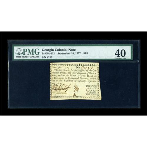 <B>Georgia September 10, 1777 $1/2 PMG Extremely Fine 40.</B></I> A scarcer Georgia issue that has remained totally problem-free. All three signatures are bold, and the note has not so much as a single edge split. Notes of this issue are particularly rare in this high grade and are unpriced above VF in the Friedberg reference.<BR><BR><b>Shipping:</b> Coins & Currency (<a target="_blank" href="http://www.heritageauctions.com/common/shipping.php">view shipping information</a>)