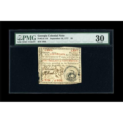 <B>Georgia September 10, 1777 $5 PMG Very Fine 30.</B></I> A spectacular piece of Georgia currency, with a razor sharp, boldly printed blue rattlesnake vignette. The note is totally free of restorations, but it has minor edge weakness along the left side. A gorgeous note that is not often seen.<BR><BR><b>Shipping:</b> Coins & Currency (<a target="_blank" href="http://www.heritageauctions.com/common/shipping.php">view shipping information</a>)