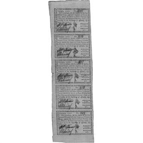 <B>Georgia September 10, 1777 Uncut Vertical Strip of Five $4/5 Extremely Fine.</B></I> This is a fully signed strip from the left side of a ten-subject sheet. These are extremely rare in multiples and practically unheard of as a quintet. There is ink haze as-made and the notes grade XF or better individually. Certainly a great multiple for a top drawer collection.<BR><BR><b>Shipping:</b> Coins & Currency (<a target="_blank" href="http://www.heritageauctions.com/common/shipping.php">view shipping information</a>)