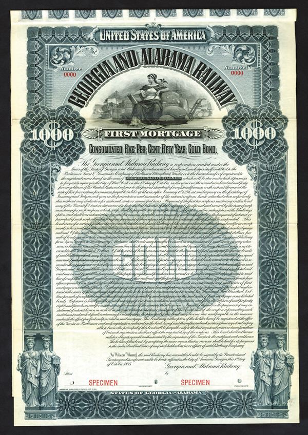 Georgia and Alabama. $1000 Specimen 5% 1st mortgage Consolidated Gold Coupon Bond, Black print on a slate blue ornate border and under tint, Image of a seated female allegorical figure at top, Specimen overprints, POC's, VF-XF condition. ABNC.