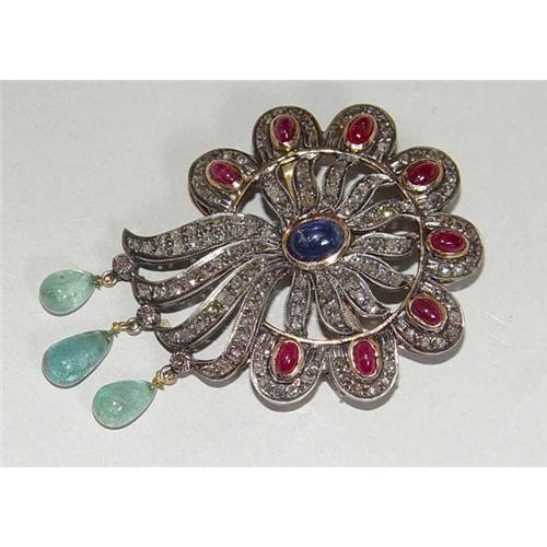 Georgian Style 14kt Gold Diamond Ruby Emerald Brooch with approximately 3ct ruby cabochon, 3ct emerald tear drops, 4.5ct pave set rose cut diamonds and a central 2ct sapphire cabochon mounted on a fancy sun or star burst form two tone 14kt yellow and white gold setting, measuring 2.5 x 1.75 inches, weighing approximately 19.5 grams and would make a fantastic gift or addition to any fine collection. ****NOTE: Email for larger images.