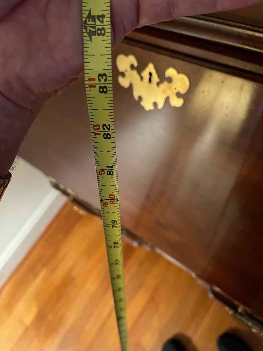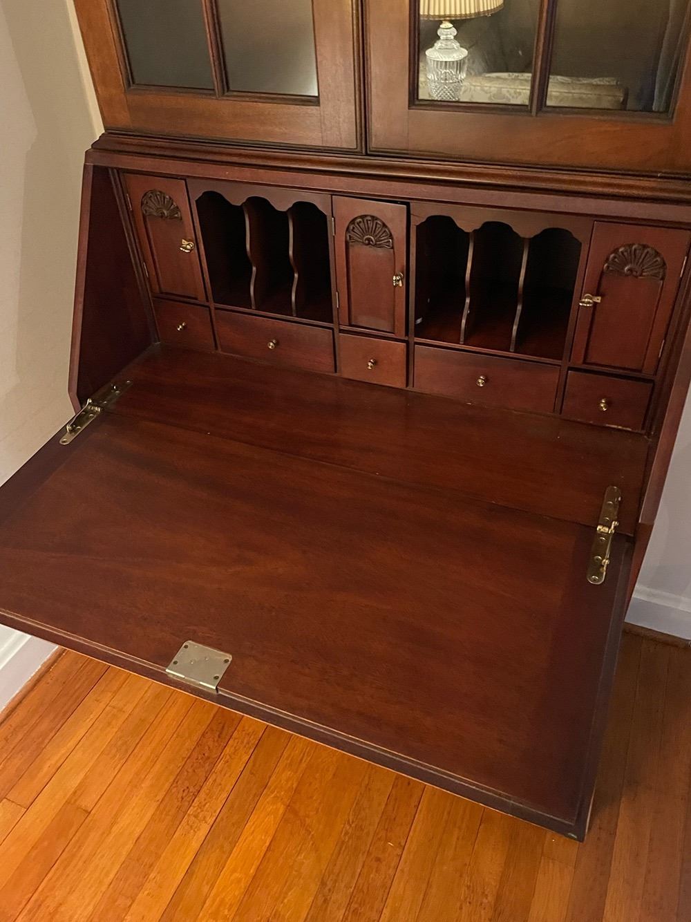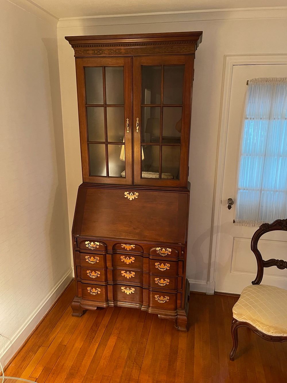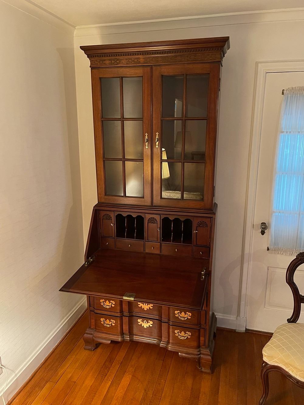 Beautiful secretary desk, Georgian Colonial block front, custom made by Council, carved top, brass hardware, measures approx. 35 inches wide x 84 inches tall.