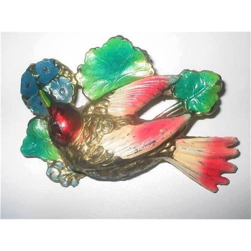 Estate brooch of the late Georgian / early Victorian era. Made of poured metal Spelter and hand painted. Figural bird, which I believe to be a Hummingbird, nestled in amongst foliage and flowers. The head is a deep crimson red, long pointed beak, body is gilted, (as is the back,) the leaves and flowers are in two tone greens and azure blue and his wings and tail are in pink and off white. Measures 2-3/4" inches by 2" inches in height and has the old "C" close on the back. The detailing is quite magnificent, excellent dimension and very minimal paint loss for a brooch of this antiquity - it is in excellent condition indeed. Spelter is a derivative of impure zinc often used as an inexpensive alternative for bronze or other more expensive metals, in cast decorative items and occasionally jewellery. Sometimes referred to as Berlin iron made in that city from 1806 and popular during the Napoleonic Wars as a show of patriotism. Spelter is an unattractive darkish grey colour in it's natural state and therefore was gilted and or painted after being poured in to molds. It has a fairly substantial weight, being a poured metal, and this particular piece is approximately 50 grams in weight. This is a rare find indeed as spelter jewellery was really only made for a limited time. This particular piece is a magnificent example of that particular period of jewellery history.