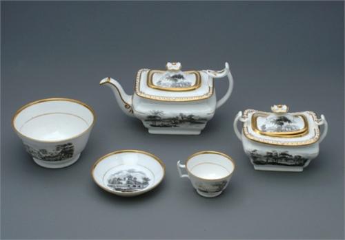 English circa 1825 <BR> Each piece decorated with a black transfer printed Yorkshire view and gilded banding, inscribed with pattern number 2/1339. <BR> 11 Tea Cups <BR> 11 Saucers <BR> 11 Tea Plates <BR> 4 Cake Plates <BR> 1 Tea Pot <BR> 1 Covered Sugar vessel <BR> 1 Waste Bowl <BR> Total 40 pieces <BR>