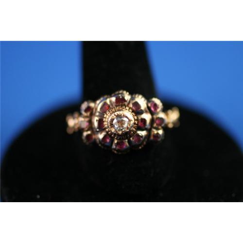 A wonderful example of Georgian jewelry! A rose cut diamond of about .12 carats is surrounded by 8 rubies and further flanked by three more rubies at each shoulder. Under a loupe, flea bite chipa are visible on many of the rubies. All stones are original to this piece. The ring weighs 4.2 and is a size 7.5 (sizable by me or by your jeweler). International shipping rates will vary. PayPal only for international orders.