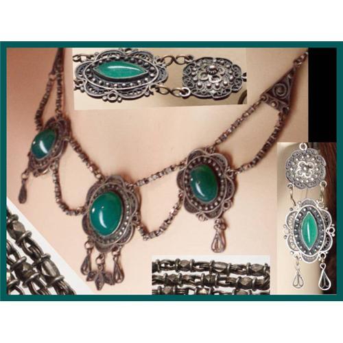 This rare set has some of the most beautiful artisan work all the way from the chain to the intricate layered metal bezels that hold these genuine Chrysoprase stones. This set is 800 silver and is so absolutely beautiful that you can?t help but to stare when you see it. This is much older than most of my Chrysoprase pieces . You are getting the necklace and drop earrings ( I have a bracelet that matches as well in another listing). The earrings are so feminine and a fine example of Georgian jewelry. These measure 2 1/2? long and are screw on. The ear wires are not 800 silver. The necklace is 15? long and the longest drop is almost 1 1/2? long.All the stones are original and have a rich eerie hue to them. The silver has a rich patina which shows off these amazing stones. Add the bracelet to this and you will have three pieces that should be in a museum, they are that great!