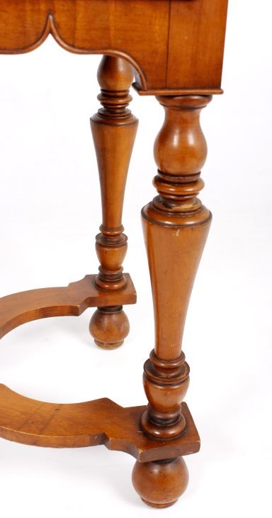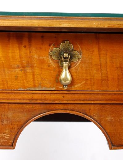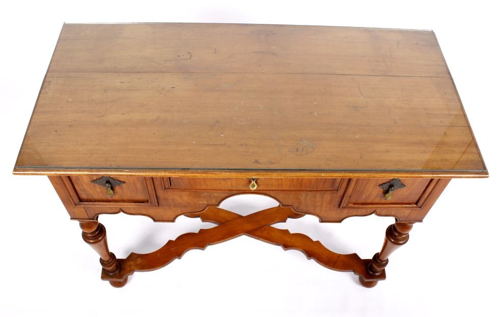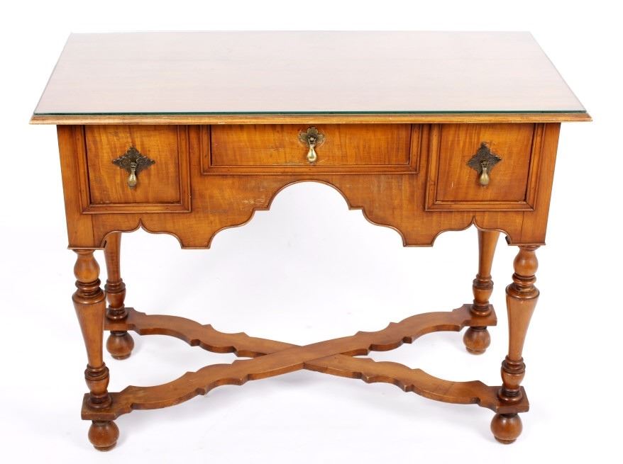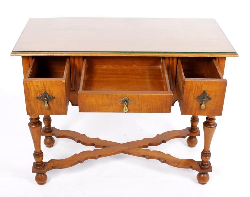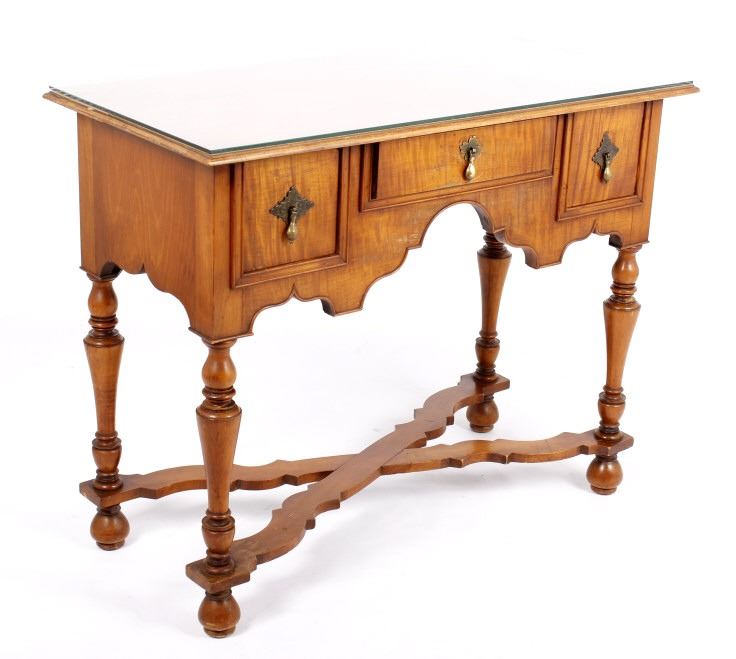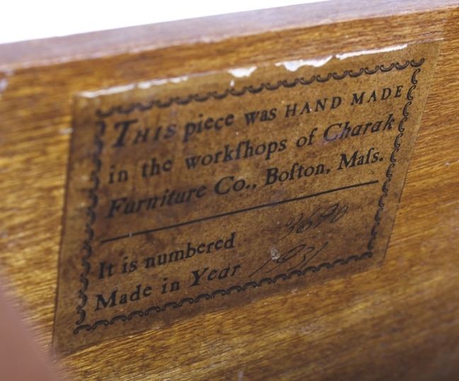You are bidding on a George II Three Drawer Lowboy or Dressing Table, 20th century, mahogany, by Charak Furniture Company, Boston, Mass. Inside a drawer is a sticker stating, "This piece was hand made in the workshops of Charak Furniture Co., Boston, Mass. - It is numbered 3690 - Made in Year 1931". The lowboy table shows wonderful brass drop handles, with decorative escutcheons behind. As well, the table has a glass pane placed atop, protecting the surface. The early lowboy shows good condition overall, there is some nicks and scratches to the table surface. It measures 37.5" wide x 18" deep x 30.5" tall.