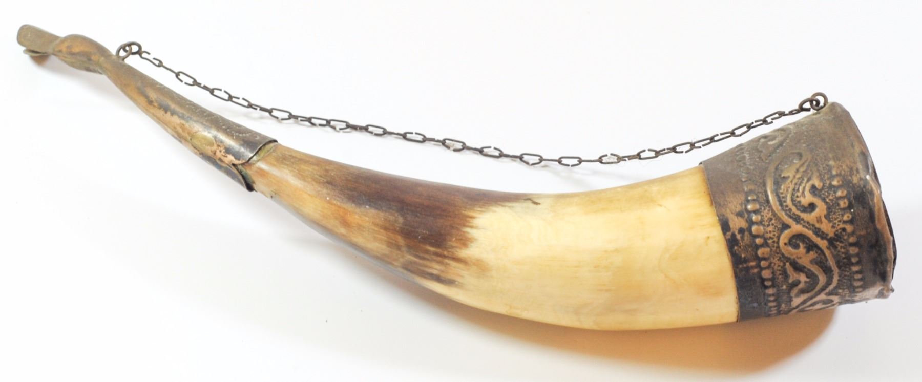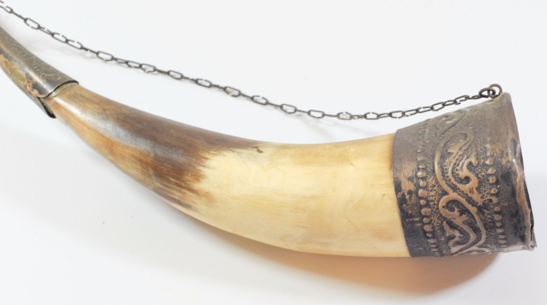 Georgian hunting horn for drinking, first half of the 20th century, combining silver parts decorated with handcrafted piercings, tip is shaped like a duck, slightly damaged: a few dents in silver at the tip, silver pieces are signed, length: 25 cm.