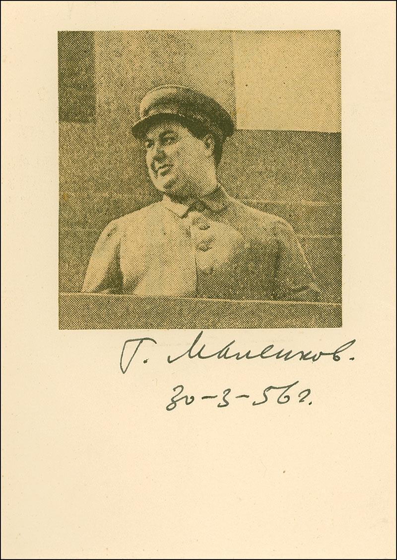 Soviet politician, Communist Party leader and close collaborator of Stalin (1902–1988). After Stalin's death, he became Premier of the Soviet Union (1953–1955) and was in 1953 briefly considered the most powerful Soviet politician before being overshadowed by Nikita Khrushchev. Vintage ink signature in Russian, dated March 30, 1956 on an off-white 4 x 5.5 slip, with a clipped photo of Malenkov affixed above signature. In fine condition.