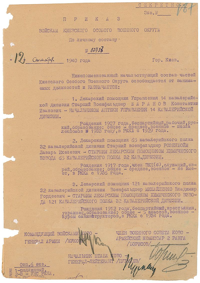 Soviet general (1896–1974) who led the defeat of the Germans at Stalingrad and the entry into Berlin during World War II. DS in Russian, signed in pencil, “Zhukov,” one page, 8 x 11.5, September 12, 1940. Zhukov orders appropriating supplies for the troops of the Kiev Special Military Zone. Signed in pencil as the Commander of the Kiev Military Zone. In good to very good condition, with scattered creasing and wrinkling, lightly affecting signature, punch holes and tears to left edge, a uniform shade of moderate toning, a few small tears, and scattered soiling.