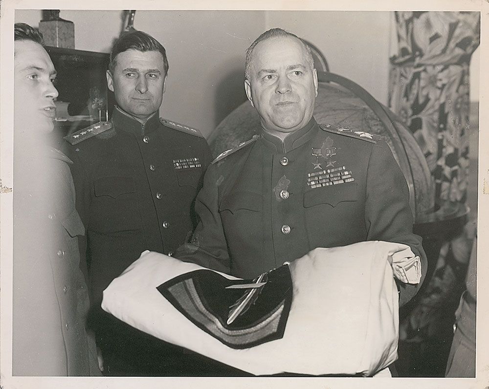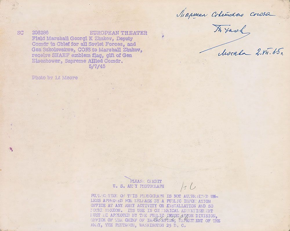 Soviet general (1896–1974) who led the defeat of the Germans at Stalingrad and the entry into Berlin during World War II. Scarce official matte-finish 8 x 10 US Army photo of Zhukov receiving the Supreme Headquarters Allied Expeditionary Force emblem flag as a gift from General Eisenhower, signed and inscribed on the reverse in Cyrillic by Zhukov. In fine condition, with a few trivial creases and tiny tape remnants to edges. Accompanied by a letter of transmittal from his office, dated August 20, 1965. This photo was taken on May 7, 1945, marking the date of Germany’s unconditional surrender and the end of the war in the European theater. Its association between Eisenhower and Zhukov is especially notable, as a close friendship grew out of mutual admiration and respect, with Eisenhower praising Zhukov’s military genius and crediting him for much of the Allies’ victory. While we have offered Zhukov documents in the past, this is the first signed photo we have encountered.