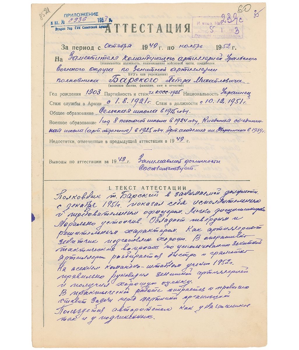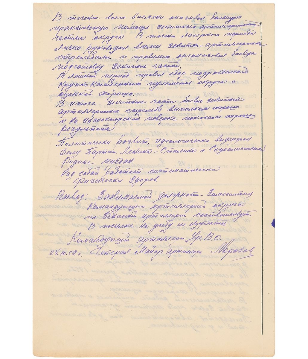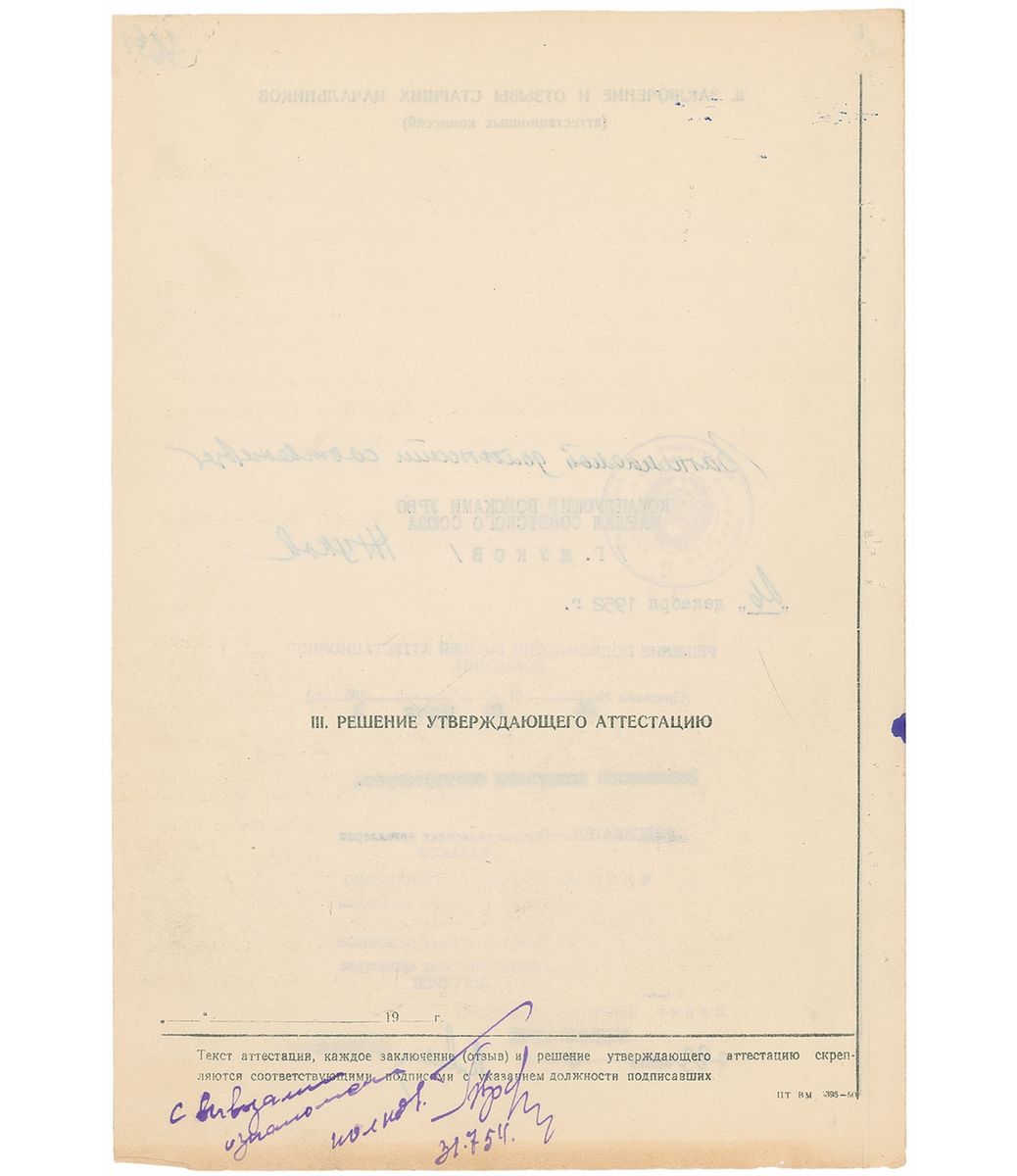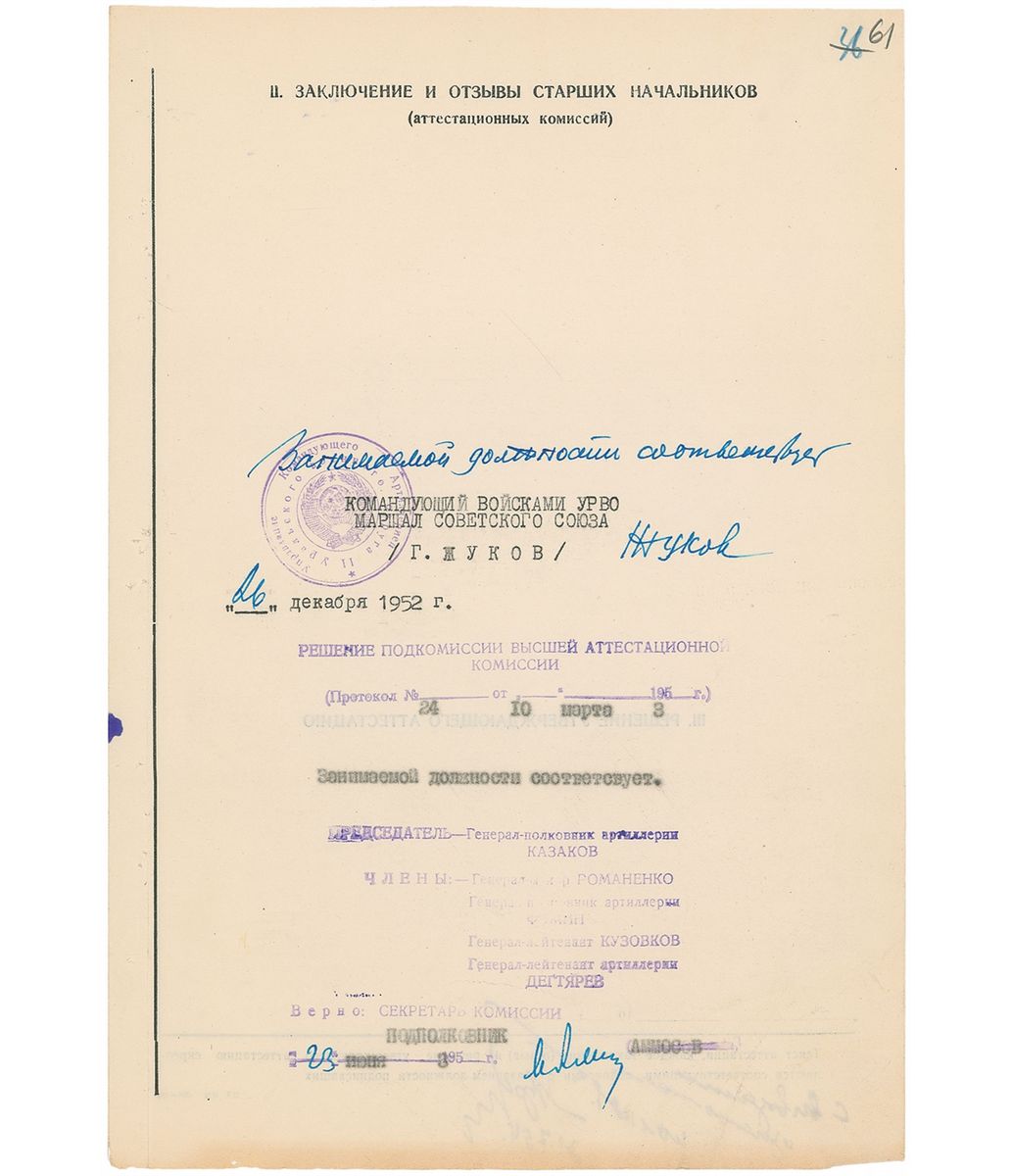 Soviet general (1896–1974) who led the defeat of the Germans at Stalingrad and the entry into Berlin during World War II. Partly-printed DS in Cyrillic, four pages on two adjoining sheets, 8 x 11.75, December 26, 1952. Zhukov certifies a military attestation by Colonel Barski Petr Michaelovich. In fine condition, with expected document wear.