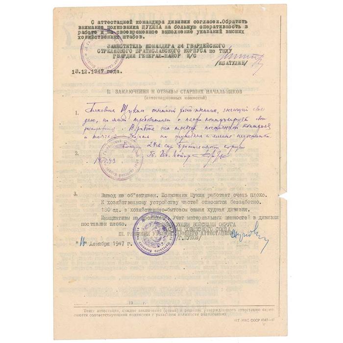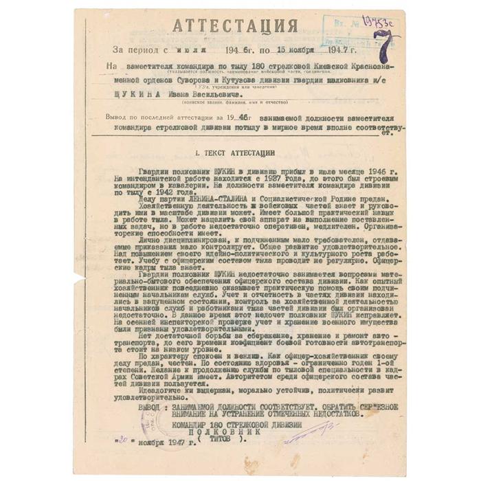 Soviet general (1896–1974) who led the defeat of the Germans at Stalingrad and the entry into Berlin during World War II. DS, in Russian, one page both sides, 8.5 x 11, 1947. Attestation of the second-in-command of the 180th Infantry Division Guard’s Colonel Schukin. Signed by Zhukov as Commander of the Kiev Military District, Marshall of the USSR. In very good condition, with scattered toning and soiling, light handling wear, a couple small edge tears, and expected stamps. RRAuction COA.