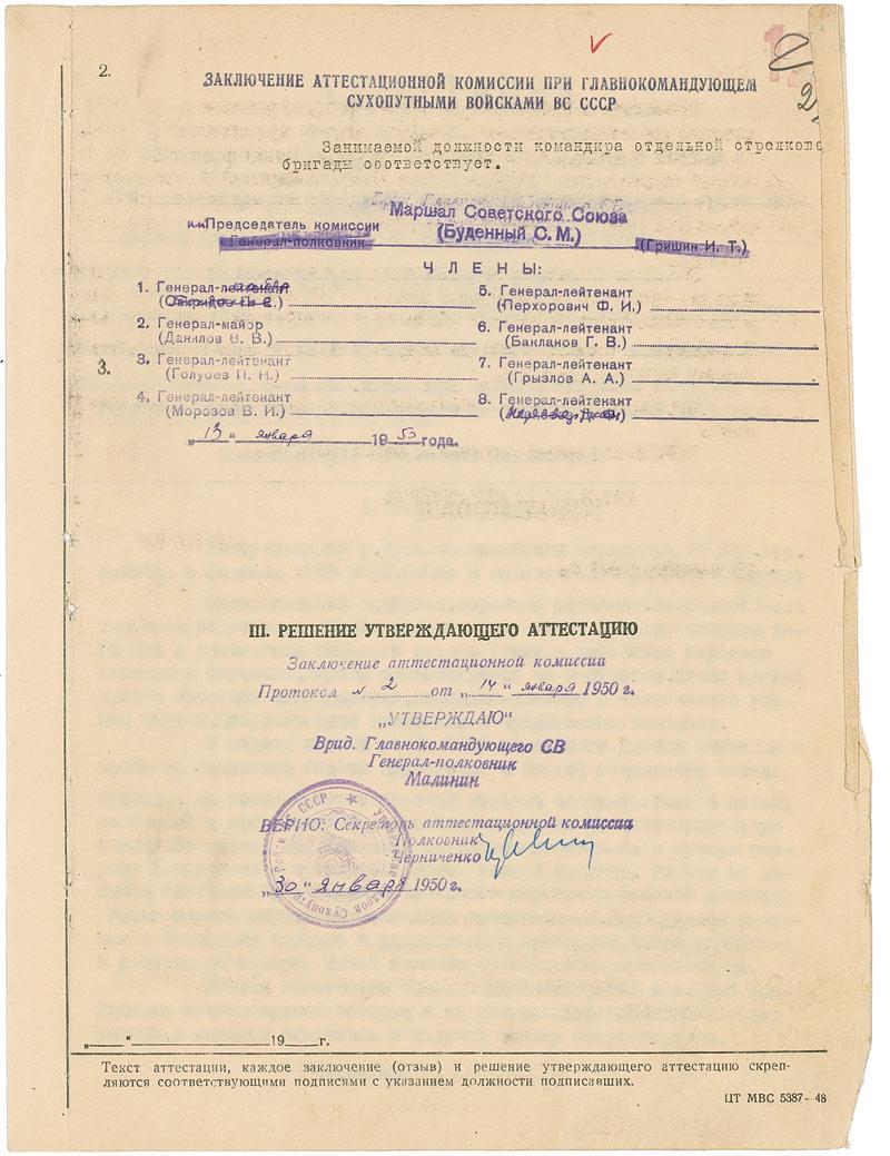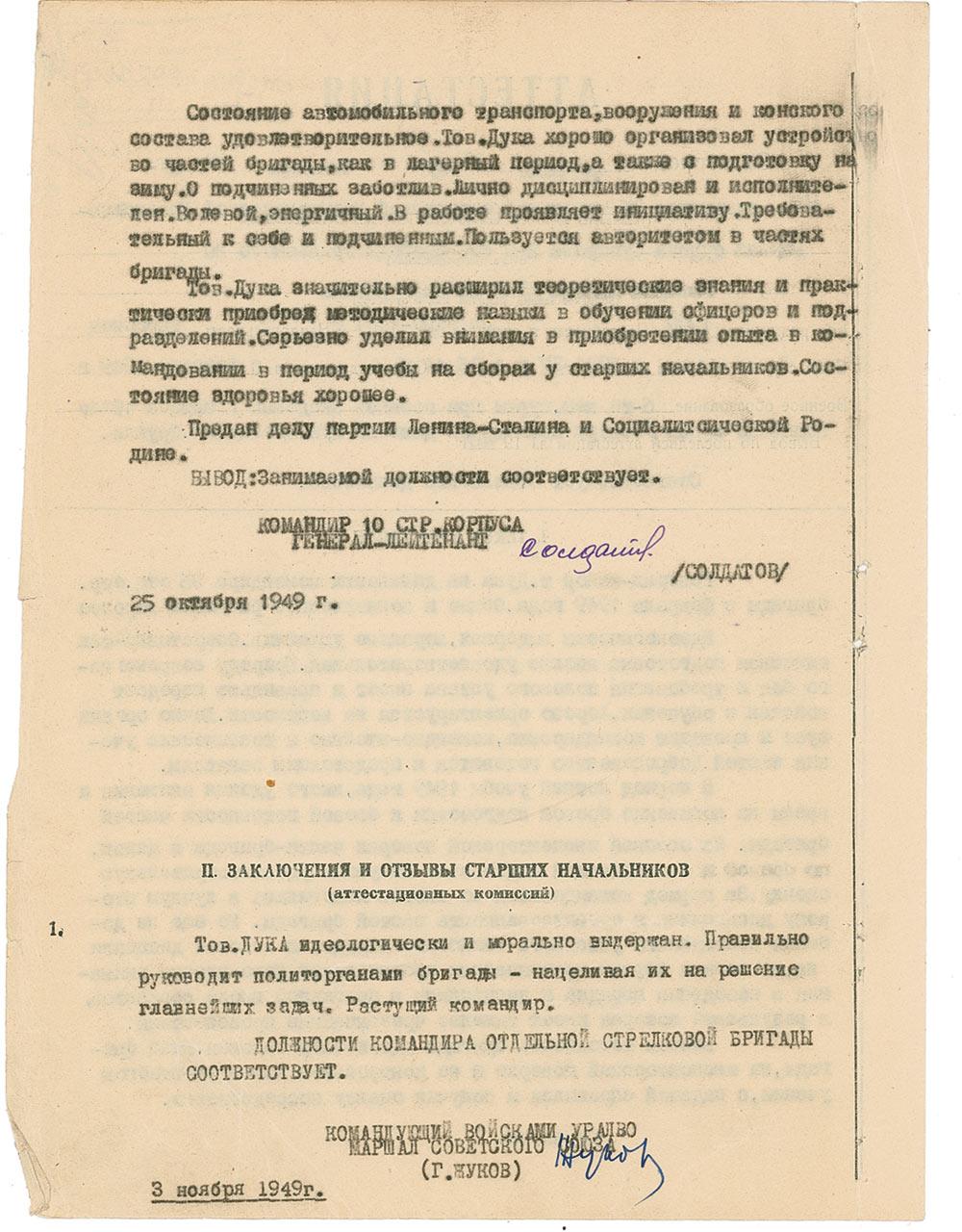 DS, in Russian, three pages on two adjoining sheets, 8.75 x 11.75, February 14, 1950. An untranslated military document signed in ink by Zhukov and one other. In very good condition, with edge creases, a few small tears, and official stamps. RRAuction COA.