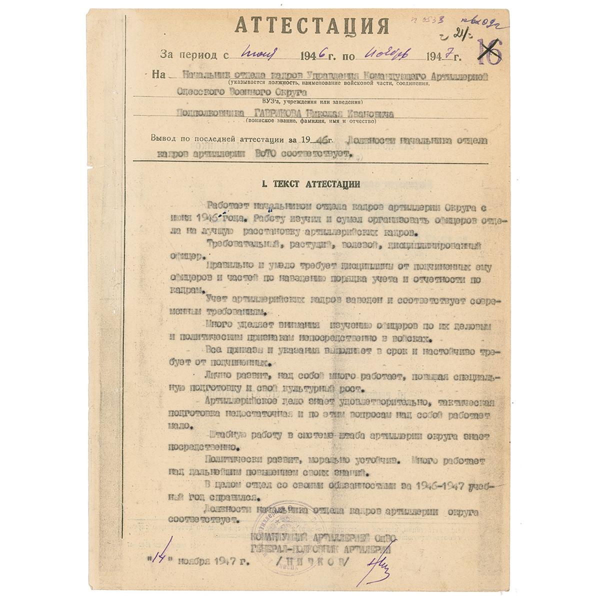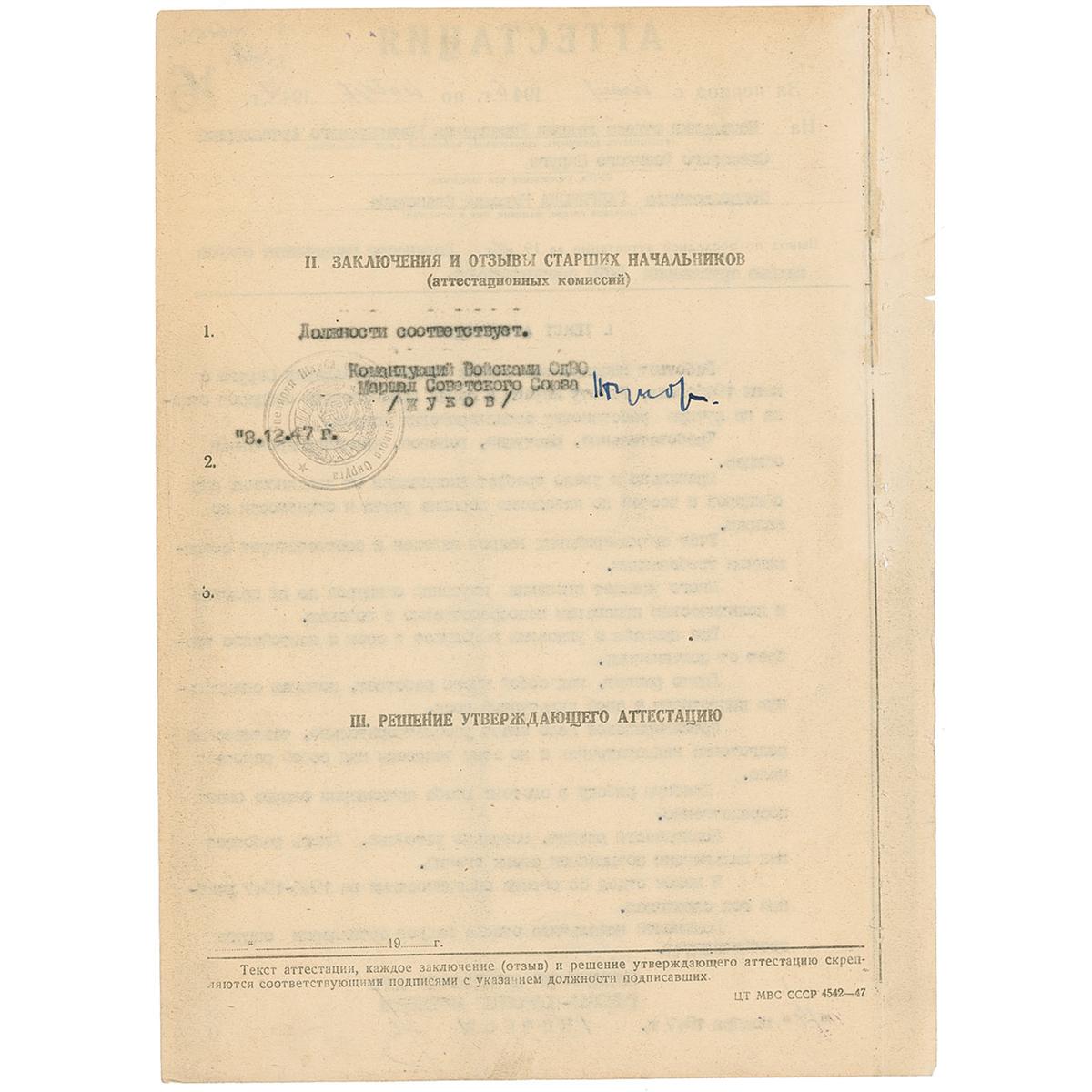Soviet general (1896–1974) who led the defeat of the Germans at Stalingrad and the entry into Berlin during World War II. DS, in Russian, one page both sides, 8.5 x 11.5, December 8, 1947. Attestation of the Head of the HR Department of the Commander of the Artillery of the Odessa Military District Lieutenant-Colonel Gavrikov, Nikoly Ivanovich. Signed in ink by Zhukov and one other. In very good condition, with scattered toning and soiling, marginal binder holes to one edge, several notations, and scattered creases.