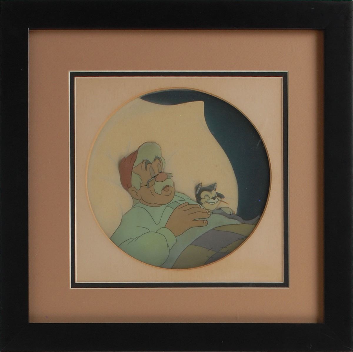 (Walt Disney Studios, 1940) Original production cel featuring Geppetto and Figaro from Pinocchio, showing them sound asleep. The cel has been trimmed and applied to an airbrushed background as prepared by Courvoisier Galleries for sale. Image measures 6.25 x 5.25, with a mat opening of 7.5 x 7.5. This piece is also framed to an overall size of 14.5 x 14.5. In fine condition.