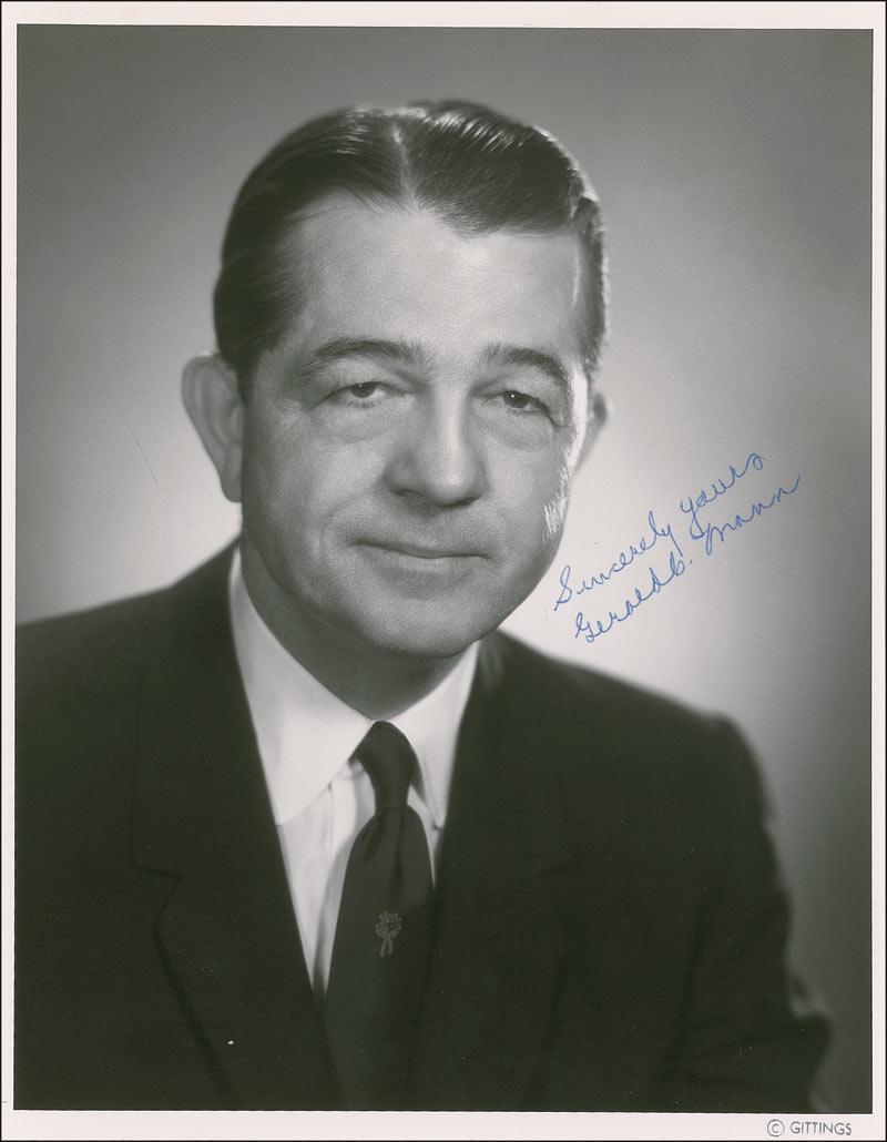College Football Hall of Famer (1907–1990) and the attorney general of Texas from 1939 to 1944. Pearl-finish 7.75 x 10 Gittins studio portrait, signed in blue ballpoint “Sincerely yours, Gerald C. Mann.” In fine condition with slight rippling at the top edge.