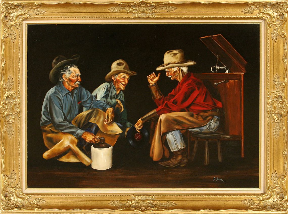 Gerald Farm (b. 1935). The Storytellers. 30" x 40" oil on board. Signed lower right: G. FARM 1971. (est. $2,000-4,000). Provenance: The S. George & Helen Binson Estate, donated to the Cheyenne Frontier Days Old West Museum (Cheyenne, WY).. CONDITION REPORTS: www.auctioninsantafe.com/docs/cr2012.pdf
