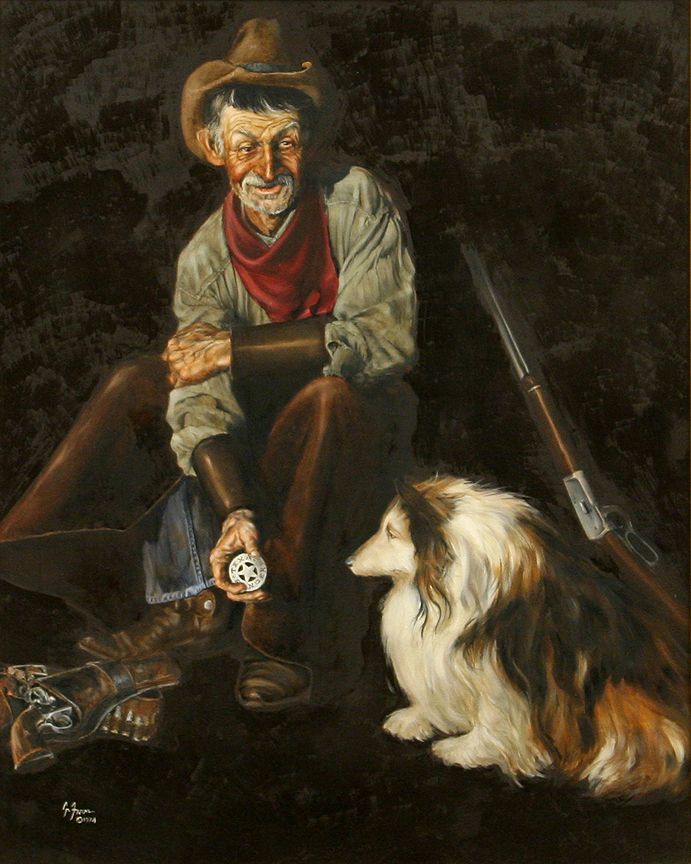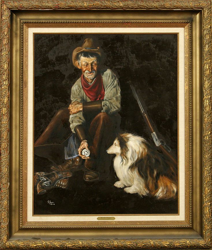 Gerald Farm (b. 1935). The Old Ranger. 30" x 24" oil on board. Signed lower left: G. FARM © 1974. (est. $1,500-2,500). Provenance: The S. George & Helen Binson Estate, donated to the Cheyenne Frontier Days Old West Museum (Cheyenne, WY).. CONDITION REPORTS: www.auctioninsantafe.com/docs/cr2012.pdf