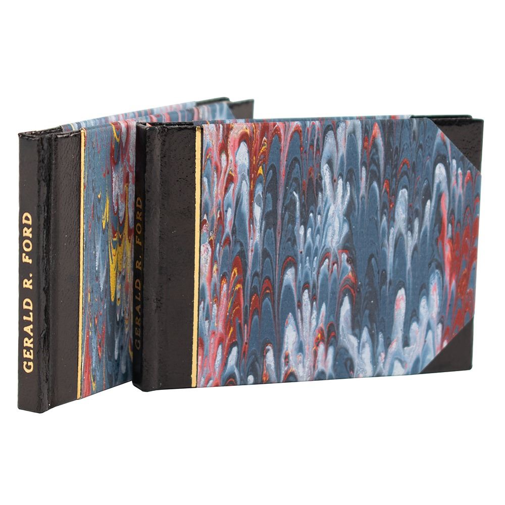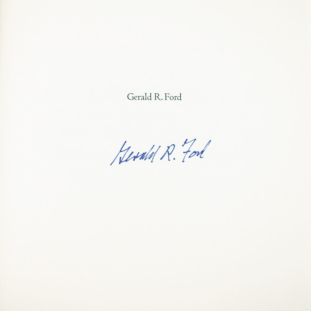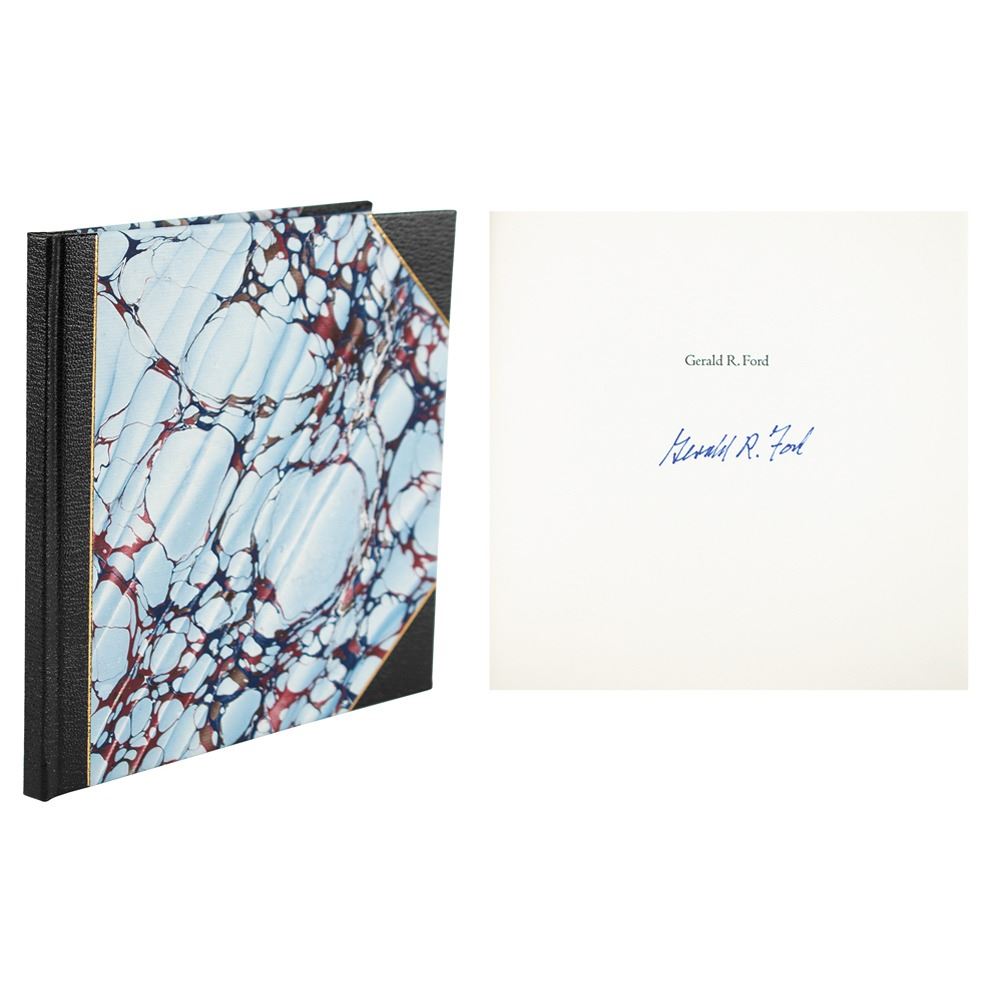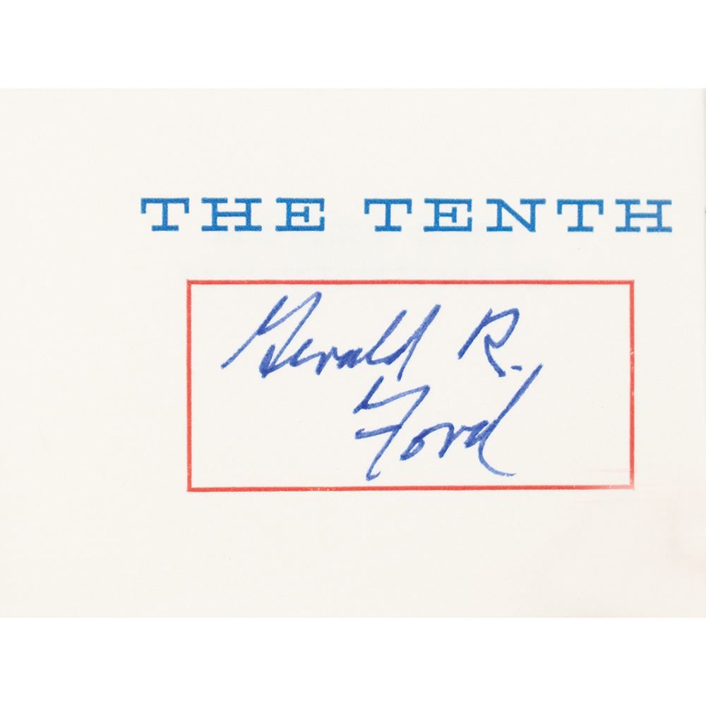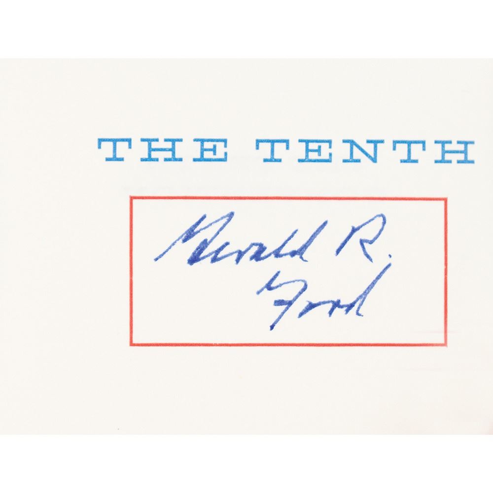 Three books signed in blue ink or felt tip, “Gerald R. Ford”—a first edition of The Thirty-Eighth President, hardcover with slipcase, limited issue of 26 lettered copies (this example not lettered), published by Bacon & Company in 2001; and two miniature limited first editions of The Tenth Convention, hardcover with slipcases, measuring only 2.75 x 2, numbered 23/150 and 109/150, published by Lord John Press in 1988. In overall fine condition.