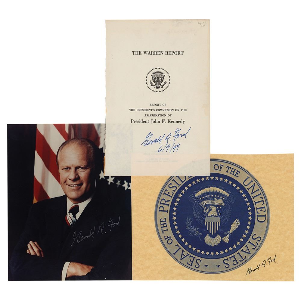 Three items: the title page from a published volume of The Warren Report, 6.75 x 9.75, signed in blue ink, "Gerald R. Ford, 6/9/94"; a 10.25 x 8 cardstock photo of the American presidential seal, signed in black felt tip, "Gerald R. Ford"; and a color glossy 8 x 10 photo, signed in silver ink , "Gerald R. Ford." In overall fine condition.