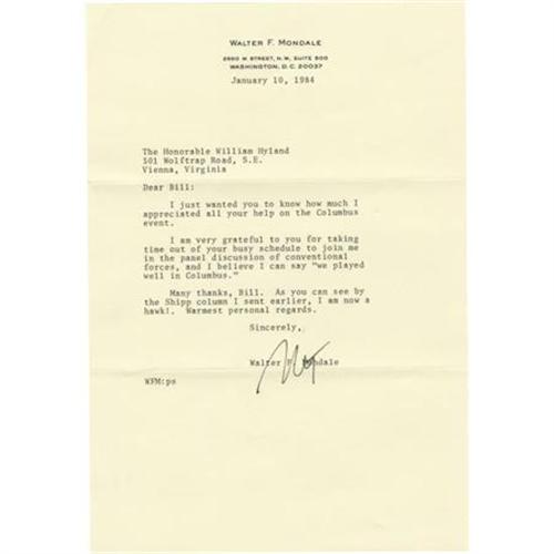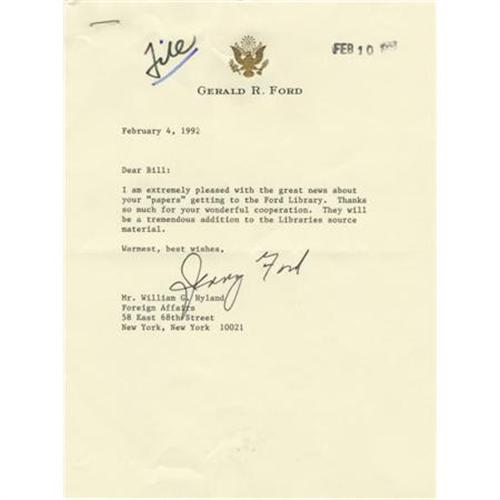 <B>Gerald Ford and Walter Mondale Typed Signed Letters.</B></I> A lot of two letters from the former President and Vice-President including: a one page typed letter signed "<I>Jerry Ford</B></I>", 6.25" x 8.25", on Ford's personal letterhead with United States seal embossed in gilt, February 4, 1992, to William G. Hyland (former National Security advisor), New York, thanking him for donating papers to the Ford Library, with the usual fold creases, a single staple in the upper left corner, with a date stamp in the upper right corner and "File" in ink at the upper left corner, else near fine; and a one-page typed letter signed "<I>Walt</B></I>", 7.25" x 10.5", on Mondale's personal letterhead, Washington, January 10, 1984, to William Hyland, Vienna, Virginia, thanking him for attending a panel discussion in Columbus, Ohio, with the usual fold creases, else fine.<BR><BR><BR><b>Shipping:</b> Flat Material, Small (<a target="_blank" href="http://www.heritageauctions.com/common/shipping.php">view shipping information</a>)