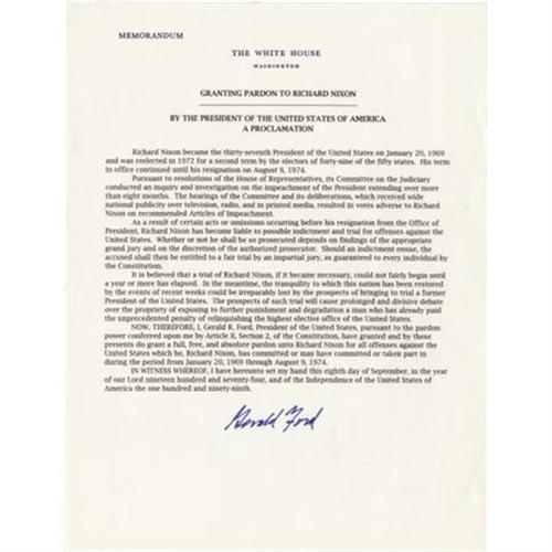 <B>Gerald Ford Presidential Pardon Document Signed,</B></I> “Granting Pardon to Richard Nixon / by the President of the United States of America / A Proclamation”, one page, 8” x 10.5”, Washington, D.C., after August 9, 1974. Bold Ford signature prominently placed in the center of the lower margin. Crisp, clean and in excellent condition. Here, in the immediate aftermath of the Watergate scandal, President Ford explains his rationale for not having the disgraced Nixon brought to trial. A great piece of American history many of us still remember. <BR><BR><b>Shipping:</b> Flat Material, Small (<a target="_blank" href="http://www.heritageauctions.com/common/shipping.php">view shipping information</a>)