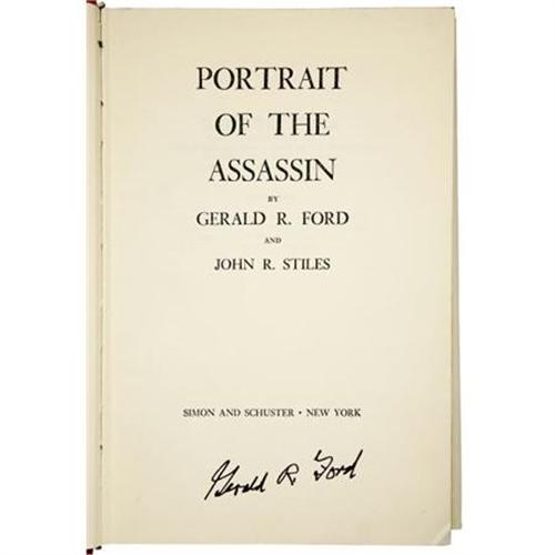 <B>Gerald R. Ford: Signed First Printing of <I>Portrait of the Assassin</B></I>.</B></I> (New York: Simon and Schuster, 1965), first printing, 510 pages, red cloth with gilt lettering on the spine, 8vo (6" x 8.5"), dust jacket. Signed "<I>Gerald R. Ford</B></I>" on the title page. About fine condition.<BR><BR><b>Shipping:</b> Books & Catalogs (<a target="_blank" href="http://www.heritageauctions.com/common/shipping.php">view shipping information</a>)