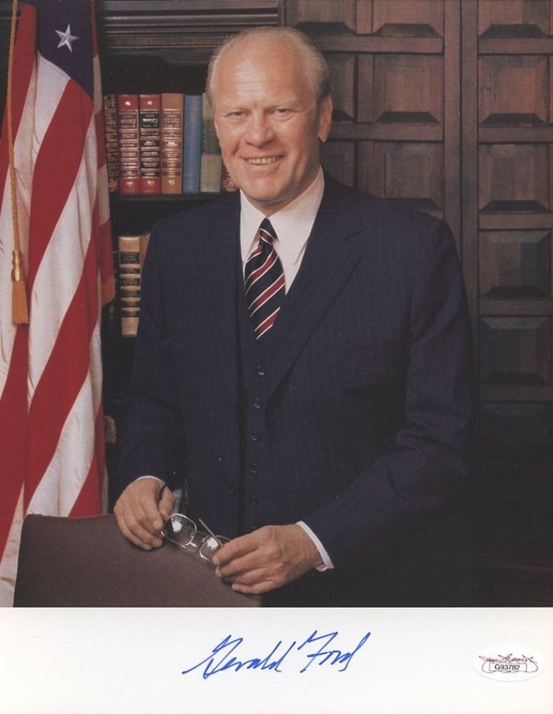 Hand-signed in blue felt-tip pen by Gerald Ford. Autograph includes an official James Spence Authentication (JSA) hologram and matching COA for authenticity purposes.