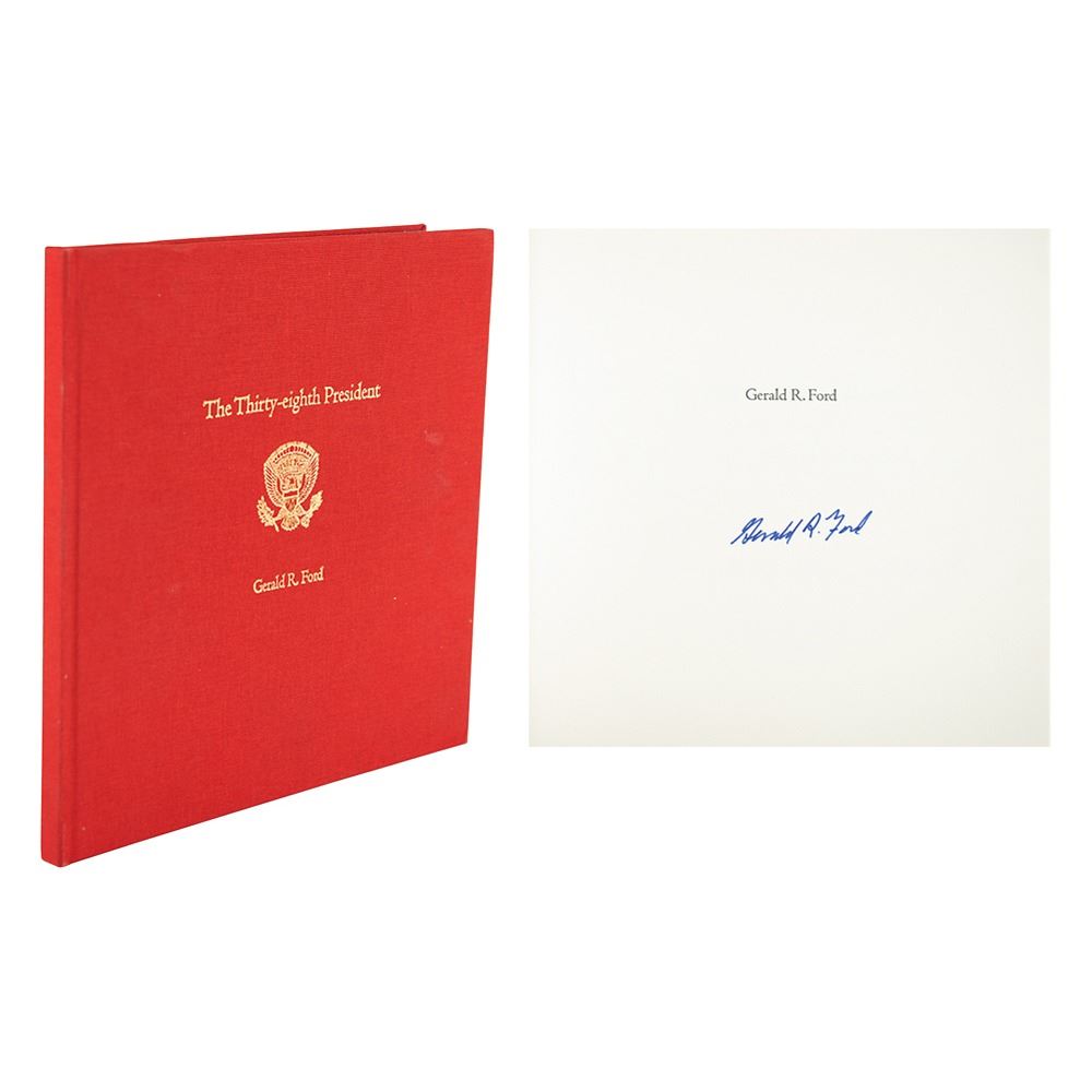 Signed book: The Thirty-eighth President. Limited edition, numbered 243/300. Reno, Nevada: Jack Bacon & Company, 2001. Clothbound hardcover, 8.25 x 8.25, 10 pages. Signed on an opening page in blue felt tip, "Gerald R. Ford." In very fine condition.