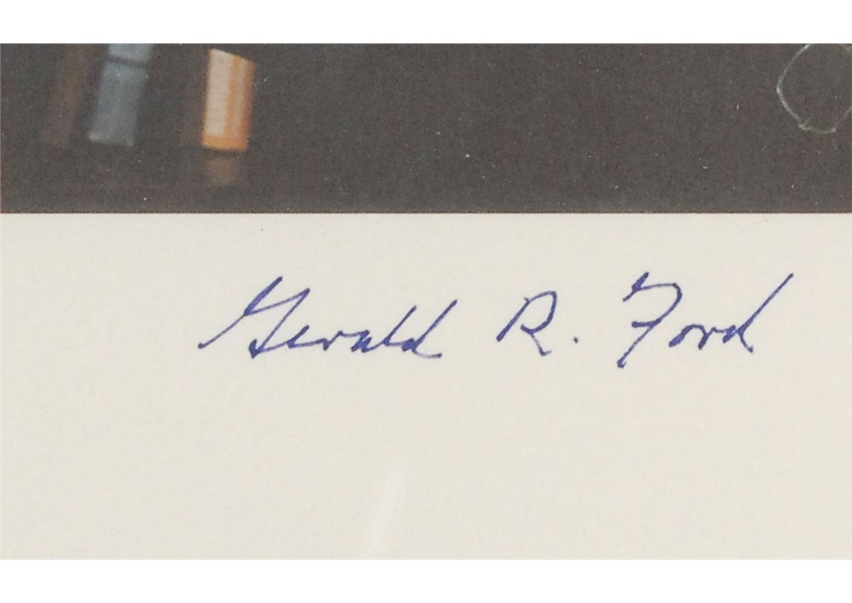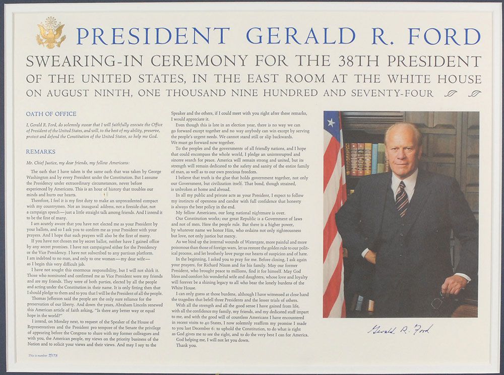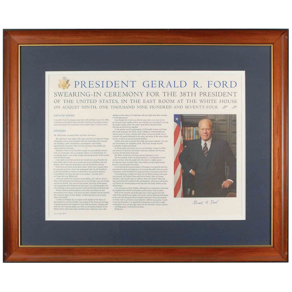Scarce limited edition color 18.5 x 13.5 lithograph broadside, numbered 7/175, bearing President Gerald Ford’s August 9, 1974, Oath of Office and remarks to the American public, as well as a color image of President Ford, boldly signed in blue felt tip, “Gerald R. Ford.” Gorgeously double-matted and framed to an overall size of 27 x 22. In excellent condition. At 12:03 pm on August 9, 1974, just a half hour after President Nixon’s resignation was made official, Gerald R. Ford took the oath of office in the East Room of the White House, becoming the first president to ever assume the position without being elected. Interestingly, Ford is the only president to have authorized a broadside like this for such a momentous occasion.