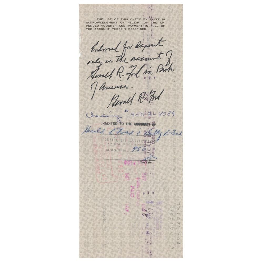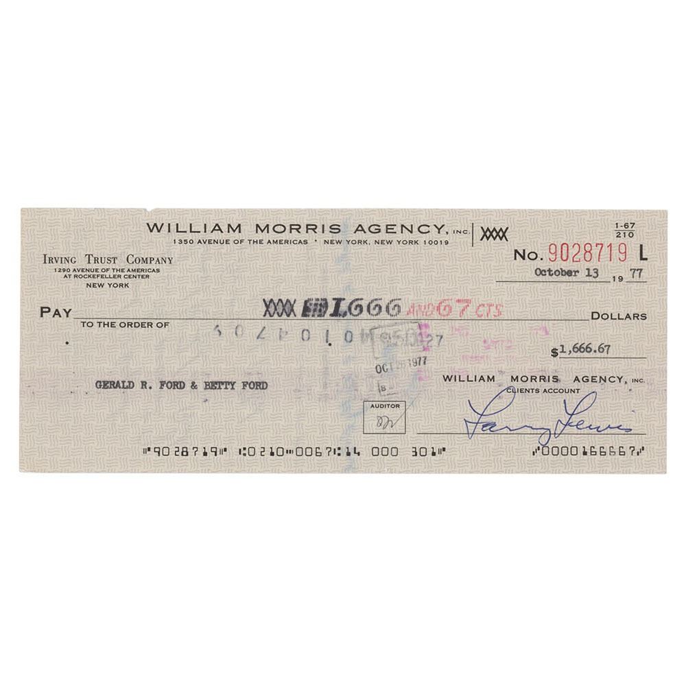 William Morris Agency business check, 8.5 x 3.5, filled out in type and signed by agency executive Larry Lewis, payable to Gerald R. Ford & Betty Ford for $1,666.67, October 13, 1977, endorsed on the reverse in ink, "Enclosed for deposit only in the account of Gerald R. Ford in Bank of America, Gerald R. Ford." In fine condition.