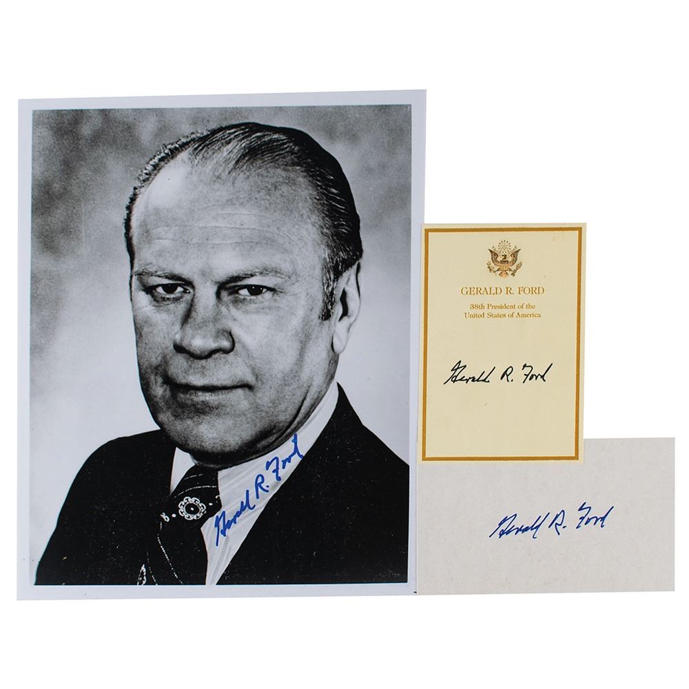 Three items signed in blue or black felt tip, “Gerald R. Ford,” which includes: a 3.25 x 4.5 presidential bookplate; an off-white 5 x 3 card; and a glossy 8 x 10 photo. In overall fine condition. The bookplate is accompanied by a transmittal letter dated August 9, 1979, and addressed to Lionel Aucoin of Spencer, Massachusetts.